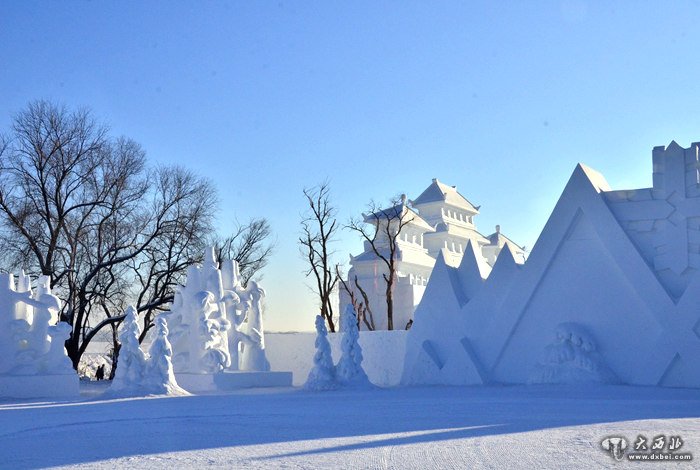 滑雪节的选手在雪雕前合影记者王帝元摄
