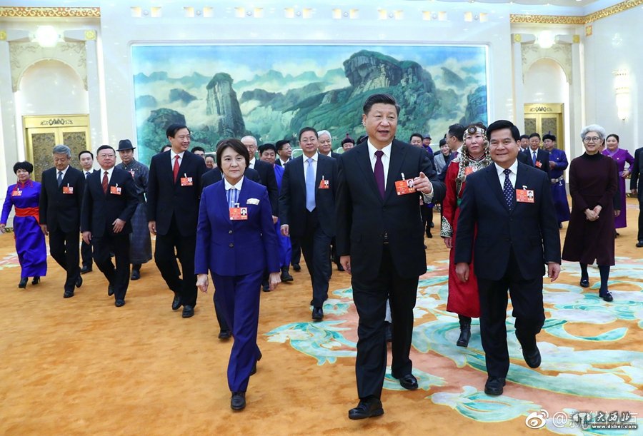 习近平指出,内蒙古是我国最早成立民族自治区、党的民族区域自治制度最早付诸实施的地方,地处祖国北疆,战略地位十分重要。内蒙古改革发展稳定工作做好了,在全国、在国际上都有积极意义。他充分肯定党的十八大以来内蒙古各方面建设取得的新成绩,希望内蒙古的同志们再接再厉,打好三大攻坚战,扎实解决好发展不平衡不充分问题,推动经济发展质量变革、效率变革、动力变革,全面做好稳增长、促改革、调结构、惠民生、防风险各项工作,推动经济社会发展再上新台阶。