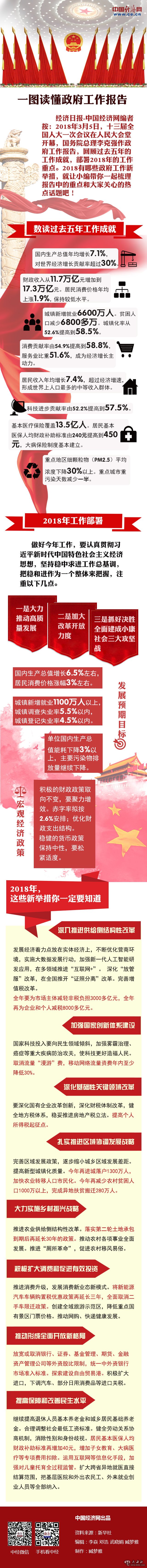 经济日报-中国经济网编者按:2018年3月5日,十三届全国人大一次会议在人民大会堂开幕,国务院总理李克强作政府工作报告,回顾过去五年的工作成就,部署2018年的工作重点。2018有哪些政府工作新举措,就让小编带你一起梳理报告中的重点和大家关心的热点话题吧!
