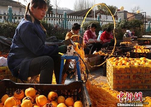 资料图:陕西省陇县天城镇范家营村农户正在采摘柿子,进行柿饼深加工。2017年在当地政府扶贫干部帮助下,该村以合作社加农户方式,正在以采摘、深加工、销售一条龙服务模式脱贫。中新社记者宋吉河摄