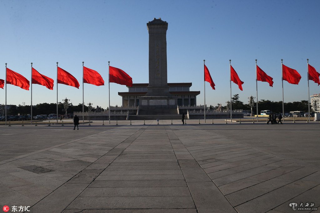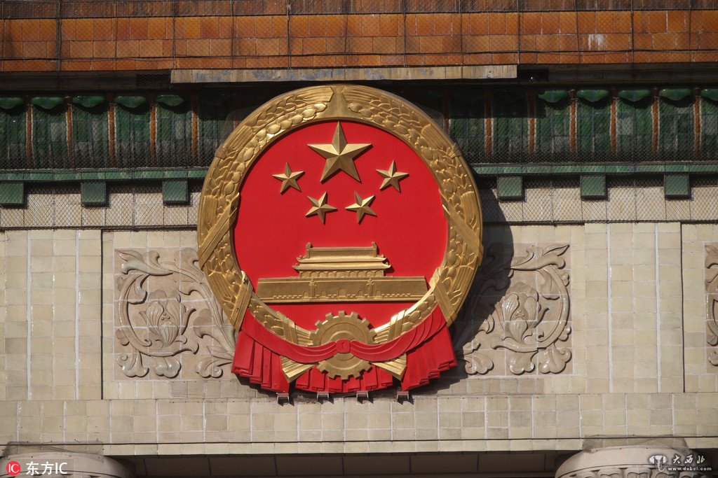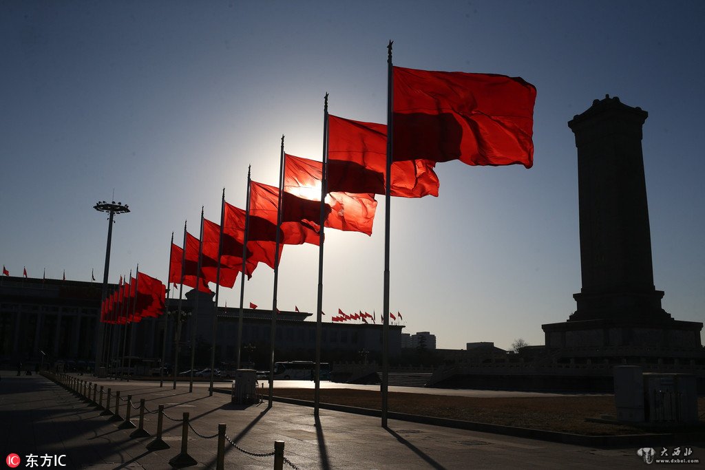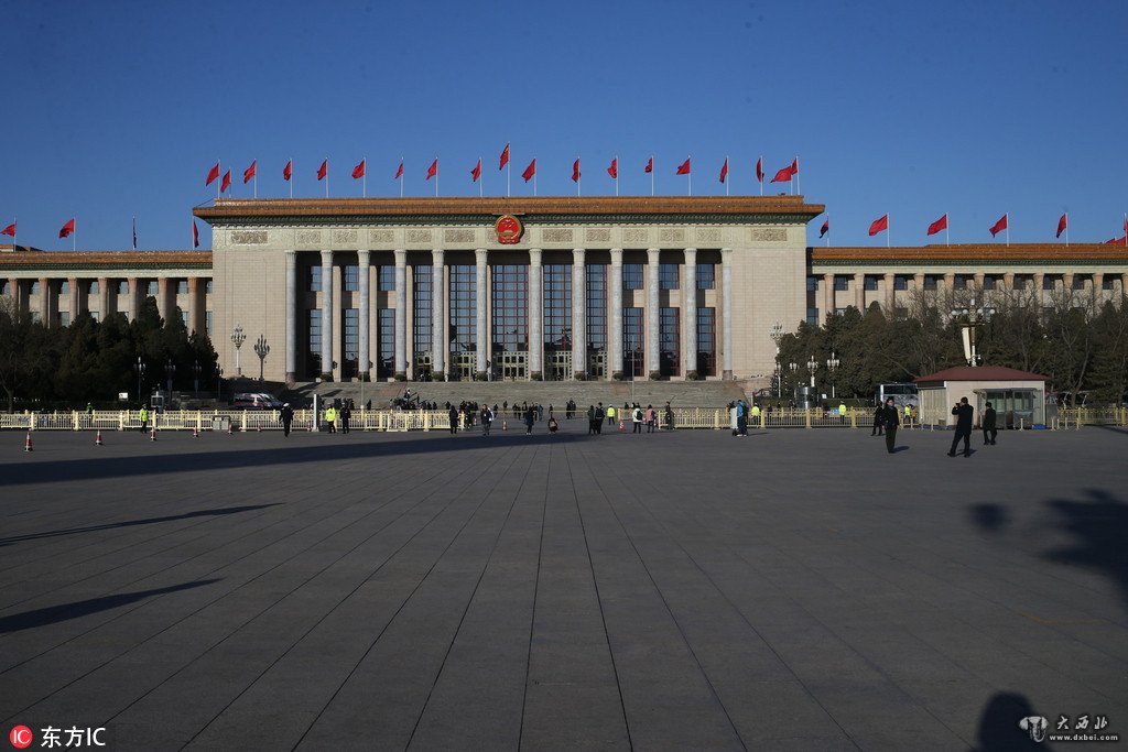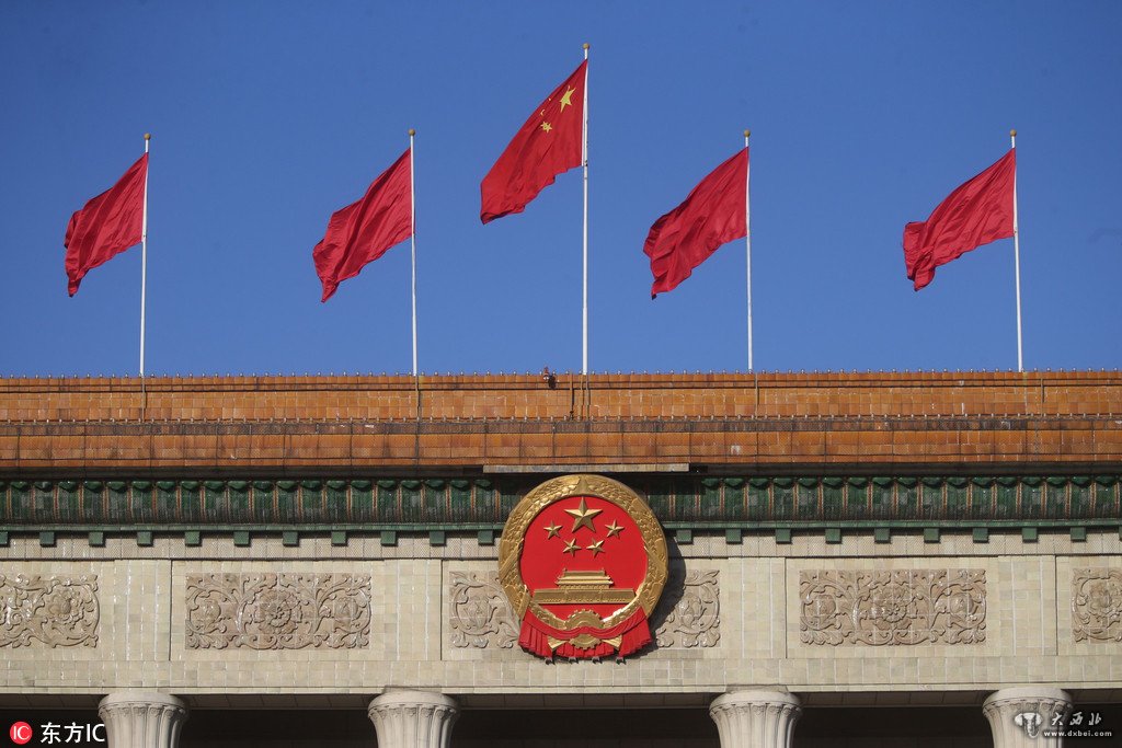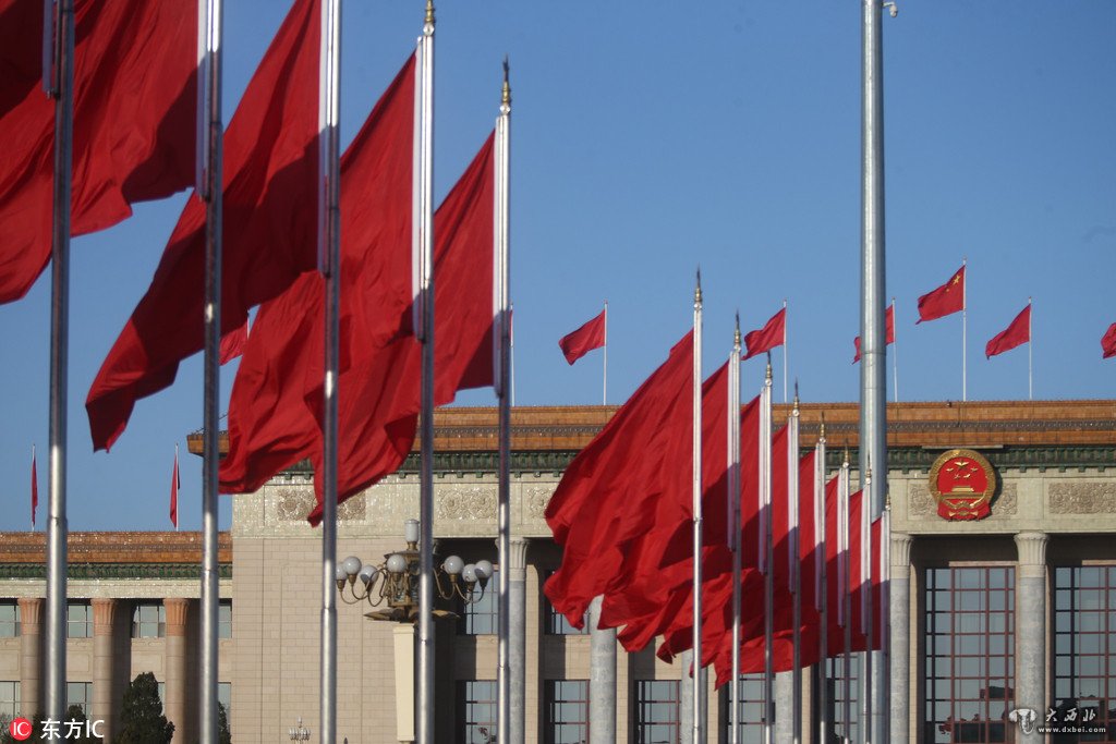 2018年3月8日,北京,全国两会正在进行时,人民大会堂前五星红旗迎风飘扬。