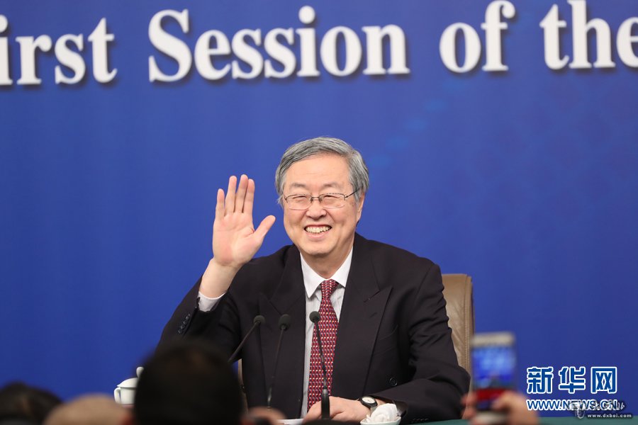 十三届全国人大一次会议新闻中心3月9日在梅地亚中心多功能厅举行记者会,邀请中国人民银行行长周小川,副行长易纲,副行长、国家外汇管理局局长潘功胜就“金融改革与发展”相关问题回答中外记者提问。图为周小川向记者招手致意。新华网/中国政府网陈杰摄