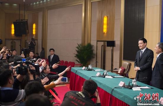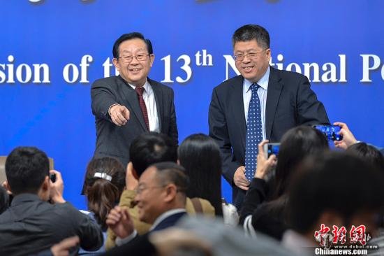 十三届全国人大一次会议新闻中心于3月10日15时举行记者会,国务院国资委主任肖亚庆,副秘书长、新闻发言人彭华岗就“国有企业改革发展”相关问题回答记者提问。中新社记者李卿摄