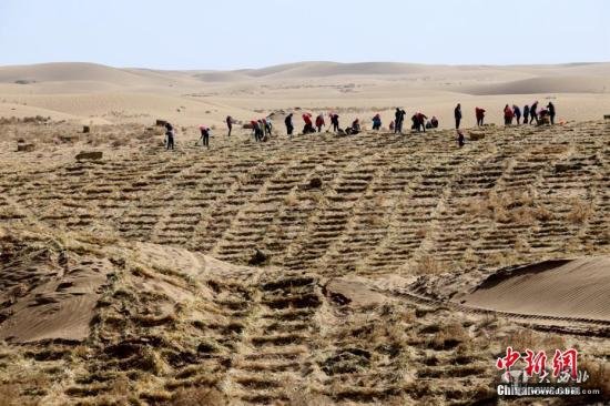 3月7日,甘肃临泽县民众在该县北部荒漠区压设麦草沙障,开展“治沙播绿、改善生态”的防沙治沙“接力赛”。多年来,该县通过生物治沙、工程治沙相结合的方式,持续防沙治沙,筑牢生态安全屏障。张渊摄