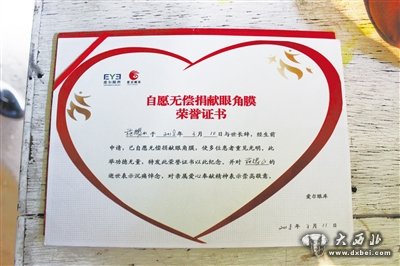 12:08,经过近一个小时,手术完成了。查验遗容后,手术人员为家属颁发了捐赠证书,然后带离眼角膜。临走时,施煜钧向红十字会和手术人员提出一个请求,他说自己的小孩再有20多天出生,父亲没有来得及看一眼就走了。他希望受捐者将来能看一眼他的儿子,也等于父亲见了孙子一面。“如果有顾虑,悄悄看一眼都行。”