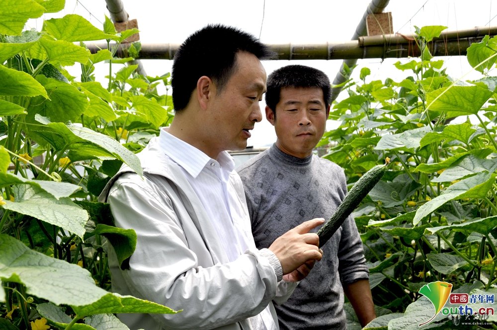 裴春亮(左)在了解蔬菜生产情况。本人供图