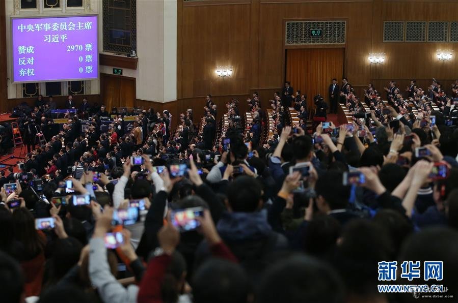 3月17日,十三届全国人大一次会议在北京人民大会堂举行第五次全体会议。习近平全票当选为国家主席、中央军委主席。 新华社记者 金立旺 摄