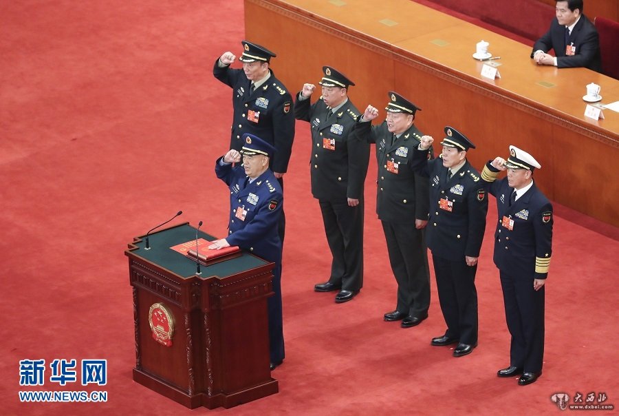 3月18日,十三届全国人大一次会议在北京人民大会堂举行第六次全体会议。大会经投票表决,决定许其亮、张又侠为中央军委副主席,决定魏凤和、李作成、苗华、张升民为中央军委委员。这是中央军委副主席、委员进行宪法宣誓。新华社记者 庞兴雷 摄