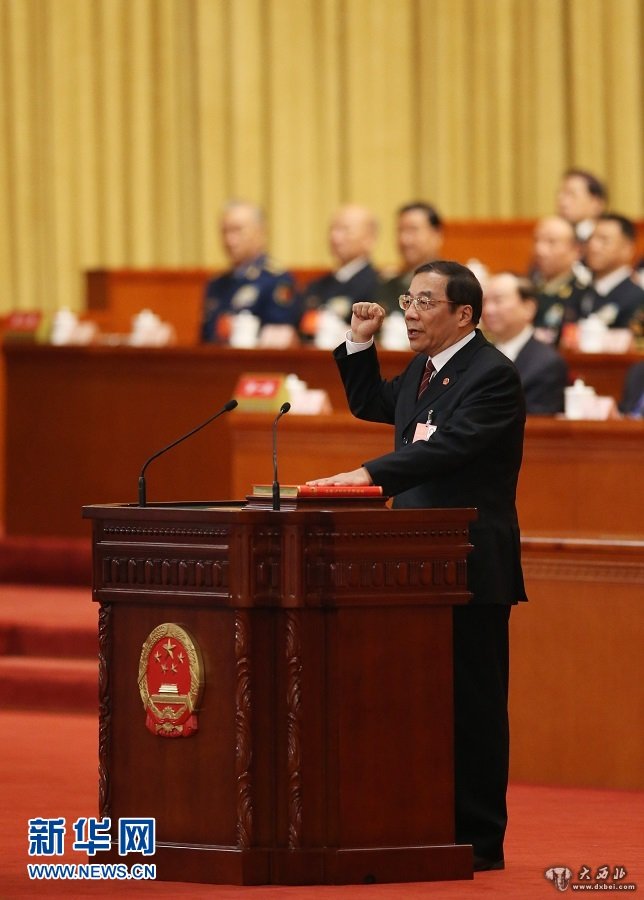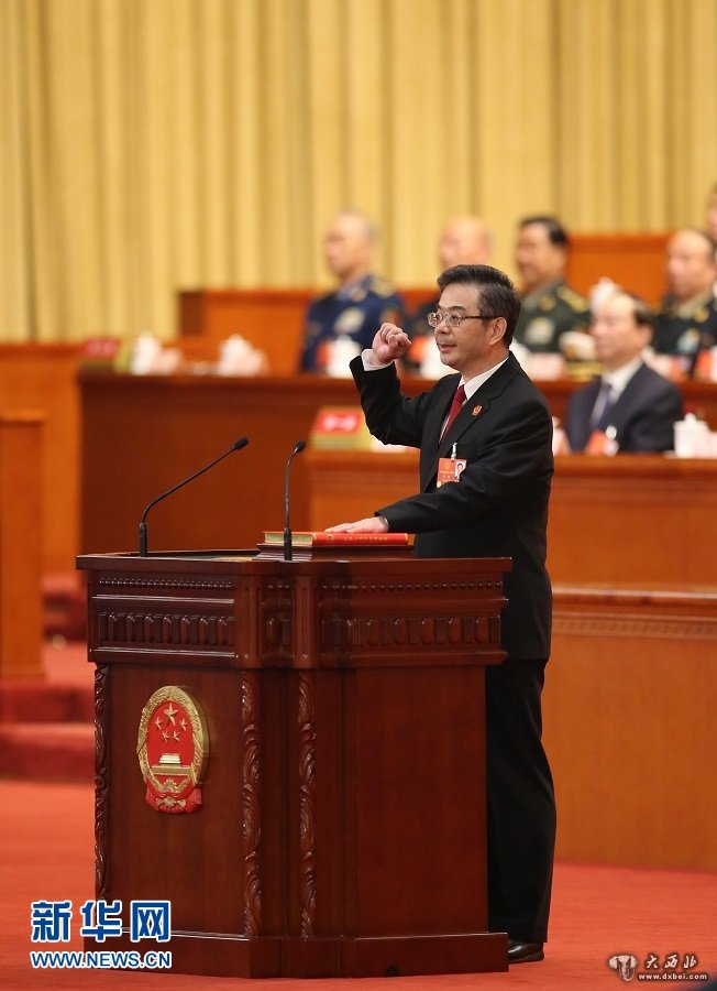 3月18日,十三届全国人大一次会议在北京人民大会堂举行第六次全体会议。周强当选为最高人民法院院长。这是周强进行宪法宣誓。新华社记者 姚大伟 摄