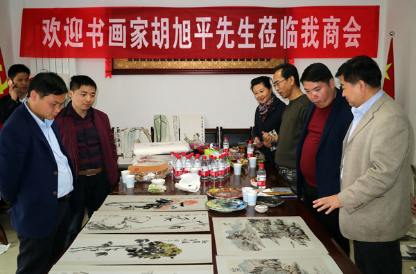 书画家胡旭平(右三)在为来宾介绍自己的作品。 贾笑云 摄