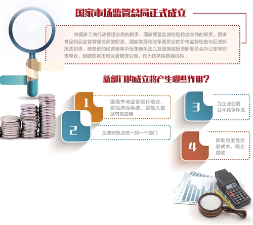 近年来,大量市场监管问题已经转到线上,新业态新模式层出不穷,传统的人盯人、上门查这一监管方式已无法适应新要求,只有利用大数据才能实现更好监管。专家表示,国家市场监管总局的正式成立,将有利于为企业创造公平的竞争环境,把反垄断执法统一到一个部门——