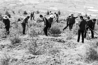 放眼望去,一块块高低不一、大小不等的山地里,一个个事先刨好的大坑排列有序、星罗棋布,四周到处都是村民弯腰躬植的身影。地埂山梁间,一根根输水管犹如苗木输液器,蜿蜒“爬行”至需水地头;景观相间处,一条条环形路四通八达,在山脊盘旋。路边,紫薇、丁香、樱花、边翘等绿化林木错落有致、美不胜收。