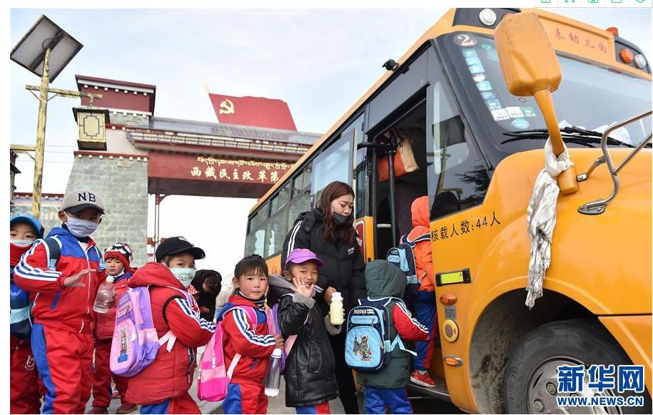 3月27日,克松村的孩子们登上校车出发去幼儿园。新华社记者觉果摄