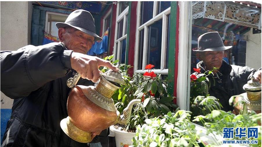 索朗顿珠在家中给花浇水(3月20日摄)。新华社记者余刚摄