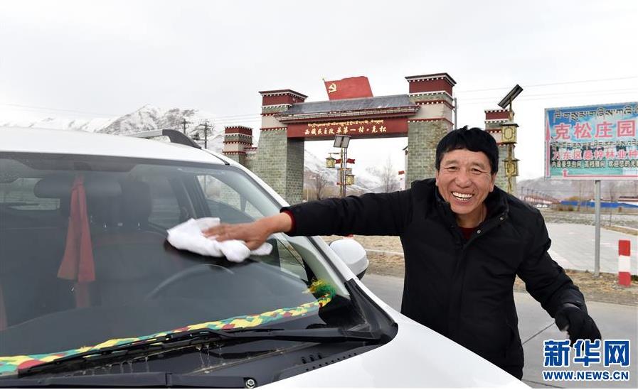 3月27日,克松村致富能手达瓦准备开车出行。新华社记者觉果摄