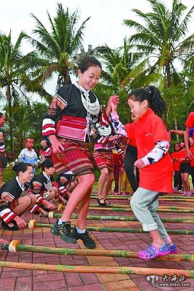 海南陵水黎族自治县小妹村,黎族妇女和游客一同跳竹竿舞。新华社发