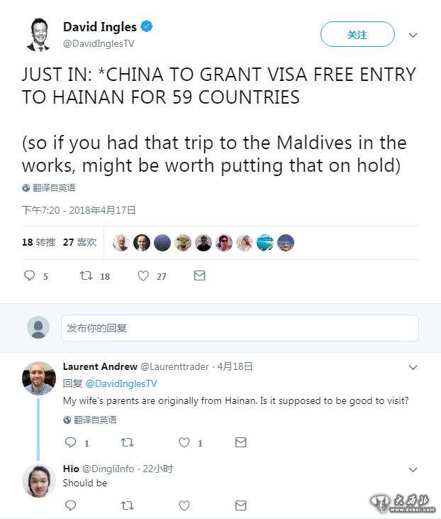 网友“David Ingles”在个人推特账号上第一时间转发了“海南免签入境政策适用国家从26国放宽至59国”的相关消息,并评论道:“如果你有去马尔代夫的计划,那你可以先缓缓了。”澳大利亚网友“Laurent Andrew”则在“David Ingles”这条推文下附和道:“我妻子的父母就来自海南,去那儿旅游应该不错吧?”