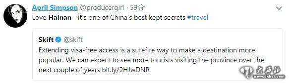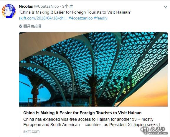 网友“Nicolas”转发了美国旅游新闻网站Skift关于此事的报道,并写道“外国游客到海南旅游变得越来越方便了”。