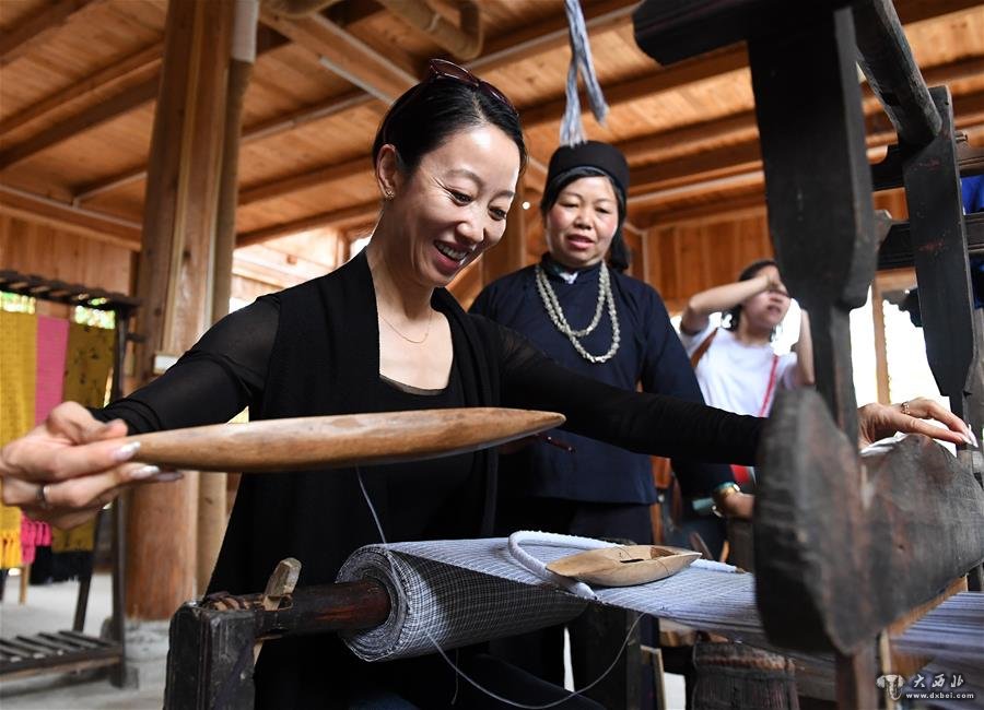4月19日,在广西南宁市青秀区南阳镇施厚村古岳坡,游客在体验传统织布。