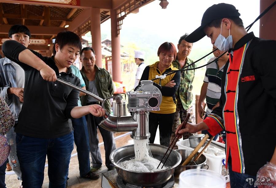4月19日,在广西南宁市青秀区南阳镇施厚村古岳坡,游客在观看米粉制作。