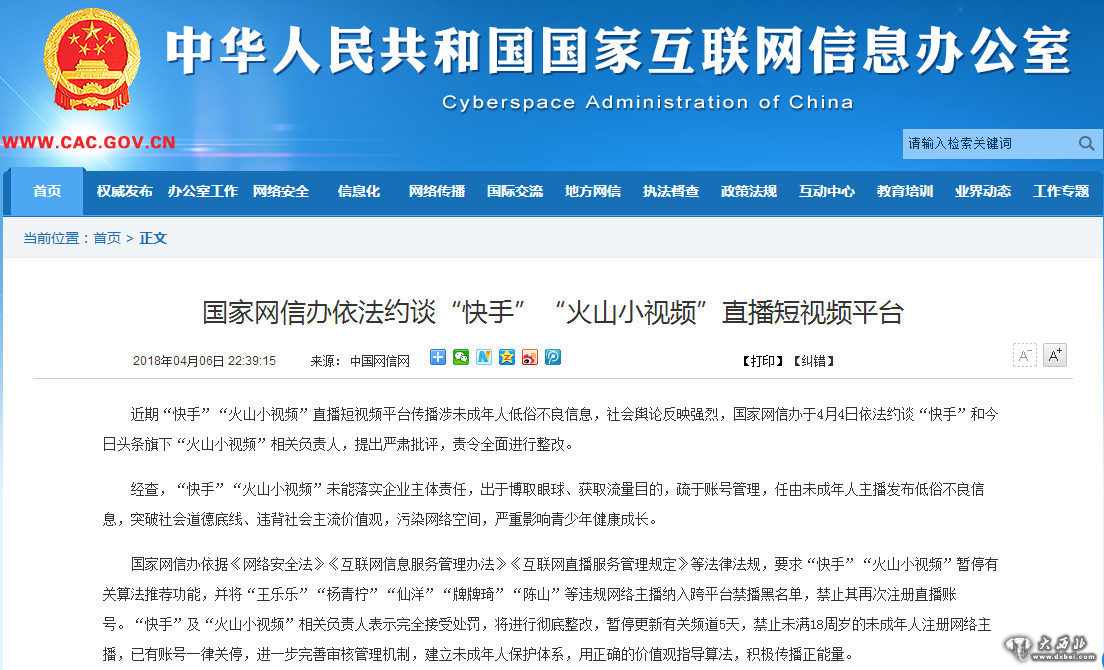 国家网信办依法约谈“快手”“火山小视频”直播短视频平台。网页截图