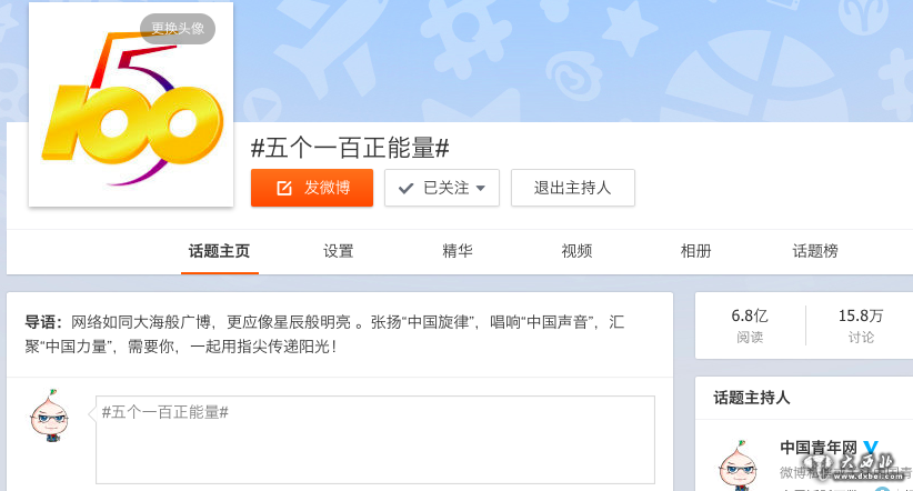 新浪微博话题#五个一百正能量#阅读量突破6.8亿。网络截图