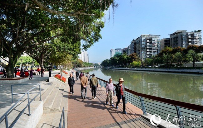 福州市民在环境优美的晋安河畔散步晨练。叶义斌摄