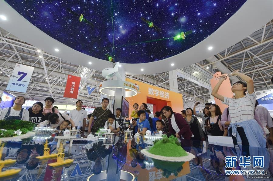 4月22日,观众在首届数字中国建设成果展览会上了解天地一体化信息网络工作示意模型。