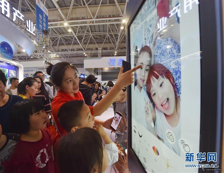 4月22日,观众在首届数字中国建设成果展览会上体验手机拍照美化软件。