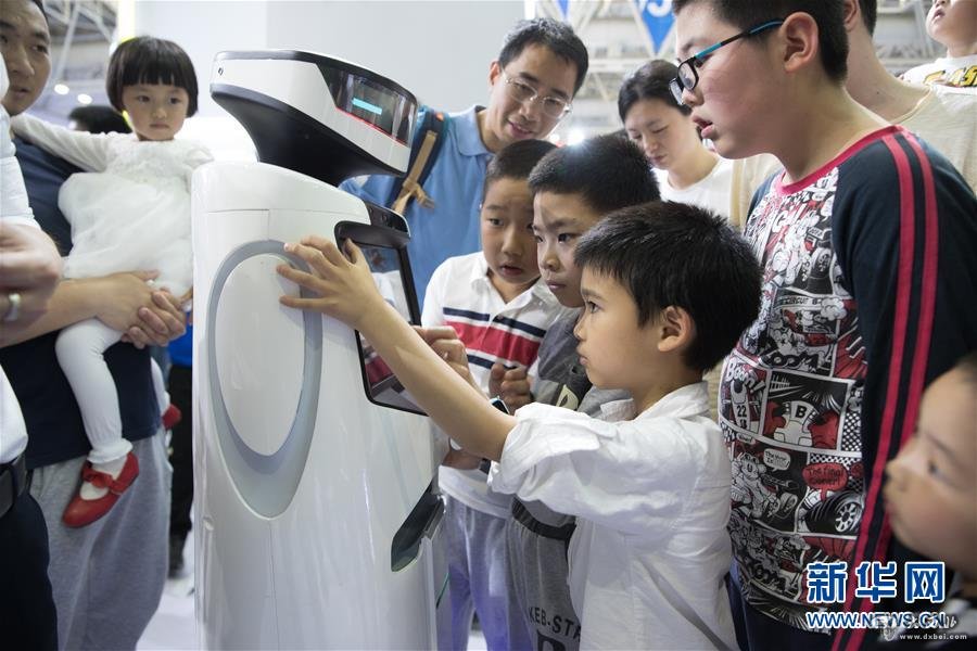 4月22日,在首届数字中国建设成果展览会上,孩子们被展出的机器人吸引。