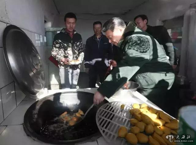 在徐学海家,得知徐学海之前因心脏病手术负债4万多元,并且不能再干重活,习近平安慰他好好养病,鼓励他乐观坚强,嘱咐当地干部深入研究因病致贫问题,采取及时有效的帮扶措施。徐学海请总书记同他们一起炸年糕,习近平高兴地同他家人一起操作起来。