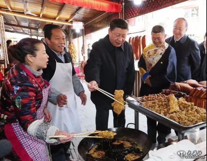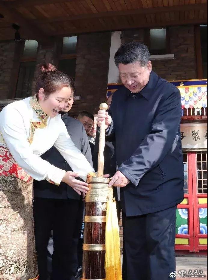 2018年2月12日,习近平总书记前往四川汶川县映秀镇考察。实地察看这里震后10年的发展振兴情况。在当地群众经营的制茶坊,总书记了解发展茶产业带动群众致富的情况,还亲自操作打酥油茶。在村民开办的饭店,总书记问生意怎么样,一家人的生活过得好不好。他还体验了炸酥肉和磨豆花的过程。总书记转动磨盘,笑着说:“很练臂力啊,真是越磨越带劲。”现场响起阵阵欢声笑语。