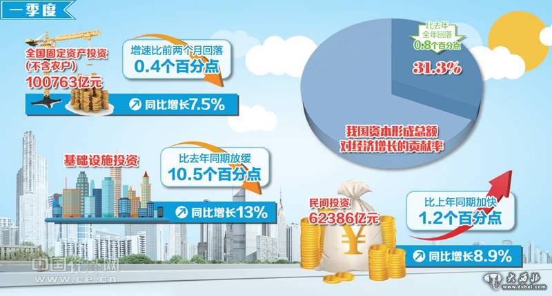 国家统计局近日公布的数据显示,今年一季度,全国固定资产投资(不含农户)100763亿元,同比增长7.5%,增速比前两个月回落0.4个百分点,比去年同期回落1.7个百分点。