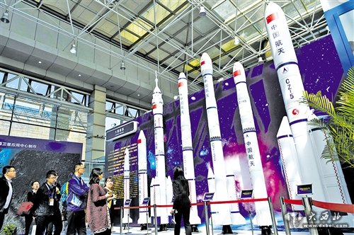 4月24日,在哈尔滨工业大学,与会者在观看运载火箭模型。新华社记者王建威摄