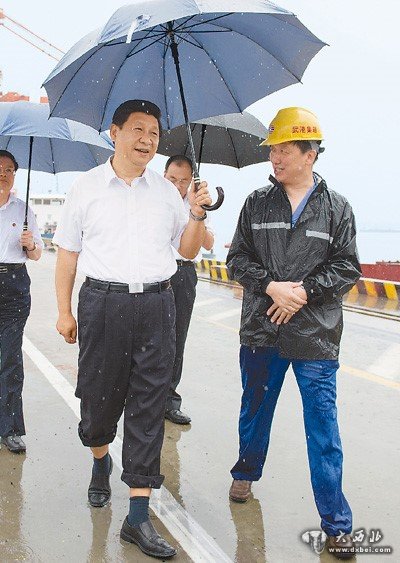 2013年7月21日上午,习近平冒雨来到武汉新港阳逻集装箱港区考察。来源:新华网