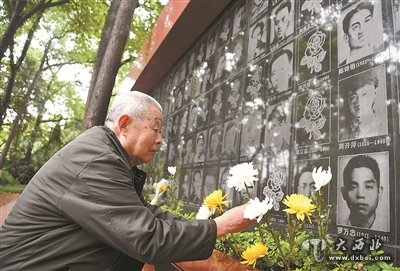 上图:重庆市民廖杨峰在重庆歌乐山烈士陵园献花缅怀革命先烈。