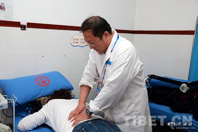 图为医务志愿者在汶川县中医医院义诊点为患者做检查。