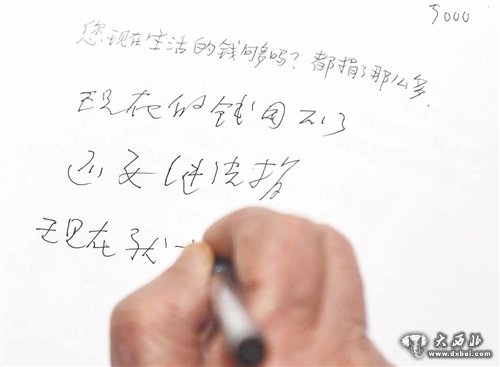 老人中年失聪,日常用纸笔与人交流,虽行动迟缓,但精神矍铄,头脑清晰。“让孩子们明白要好好读书,长大成为人才。”在与记者交流中,老人一笔一画写下自己捐献的初衷。