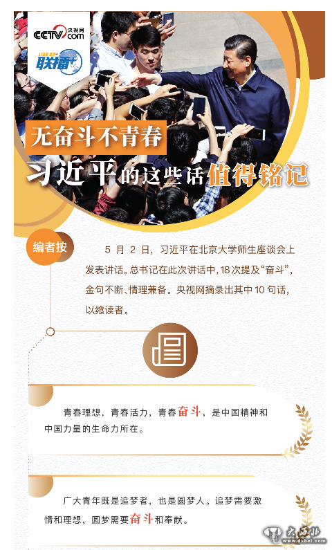 央视网消息:5月2日,习近平总书记来到北京大学考察,与北大师生座谈并发表重要讲话。他强调,广大青年应该在奋斗中释放青春激情、追逐青春理想,以青春之我、奋斗之我,为民族复兴铺路架桥,为祖国建设添砖加瓦。无奋斗不青春,一起来听听总书记殷切希望和谆谆教导。