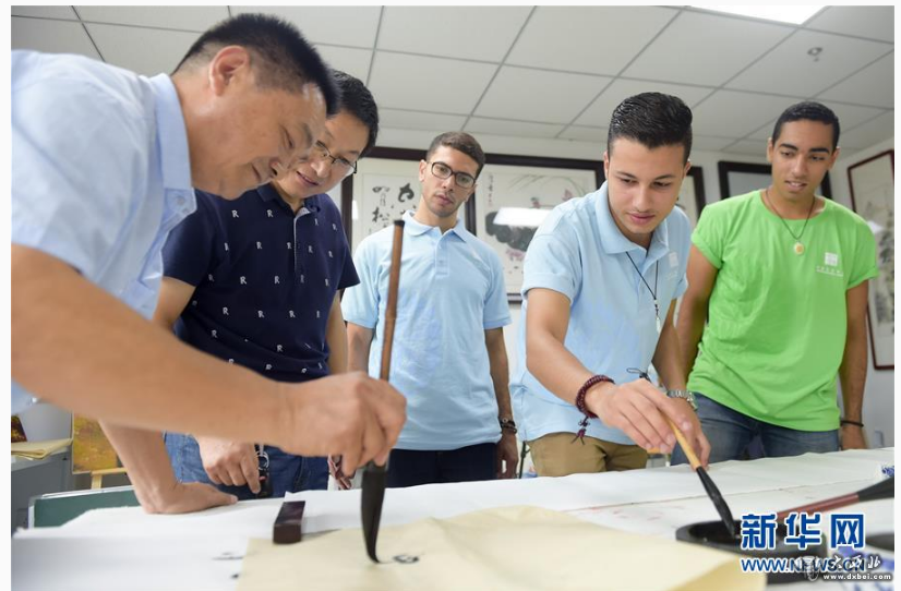 来自埃及开罗海外中国文化中心的优秀学员在学习书法。