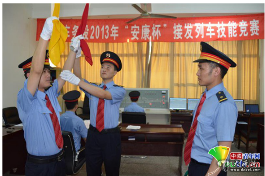 图为受伤前,徐前凯(中)为同事指导接发列车技能动作。本人供图
