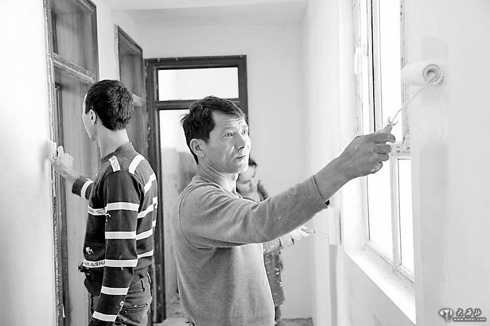 4月19日,忙力克·托合提如则(右)在工地上粉刷房屋。