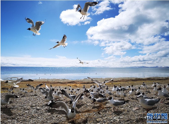 圣湖玛旁雍措旁飞舞的海鸥。新华网记者张宸摄