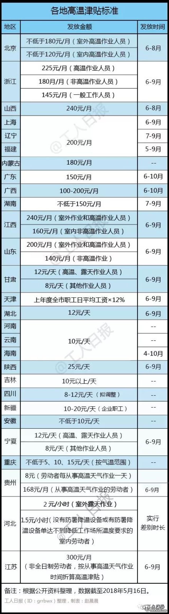 此外,各地津贴标准也不尽相同。今年,江苏省高温津贴标准就从原来的每月200元调整到每月300元。