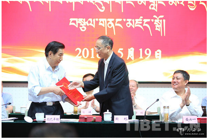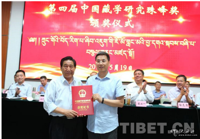 图为中央统战部斯塔同志为中国藏学研究珠峰奖荣誉奖获奖者拉巴平措颁奖。
