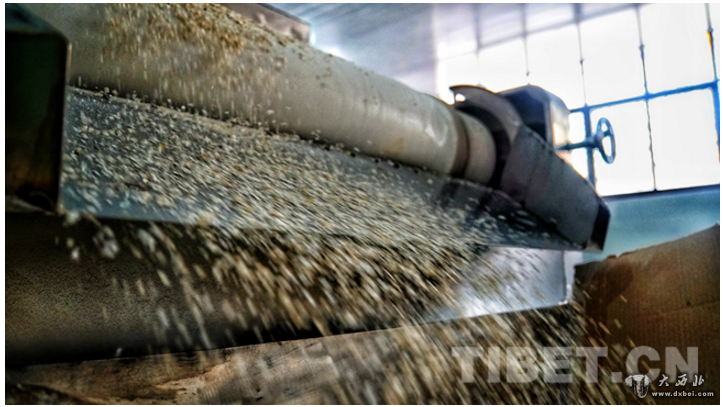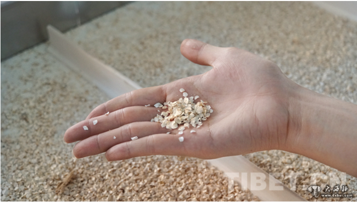 图为青稞片加工流水线,青稞片的工艺、口感与麦片类似,但风味独特。摄影:杨悦笙