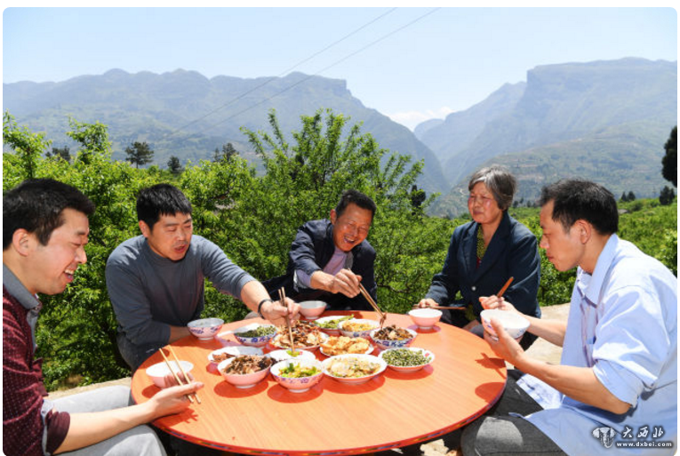 4月17日,王恩海(左三)和妻子(右二)招待帮他们盖新房的工人吃饭。新华社记者王全超摄