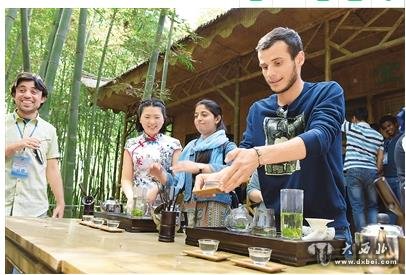 “一带一路”沿线国家留学生在在青岛西海岸新区海青街道办事处茶园体验中国茶文化。