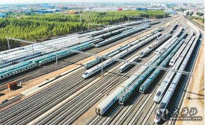 青岛世界动车小镇集聚了中车四方、庞巴迪等轨道交通核心及配套企业180余家。这是位于青岛城阳区的中车四方存车场内停放的各种型号轨道车辆(5月10日无人机拍摄)。