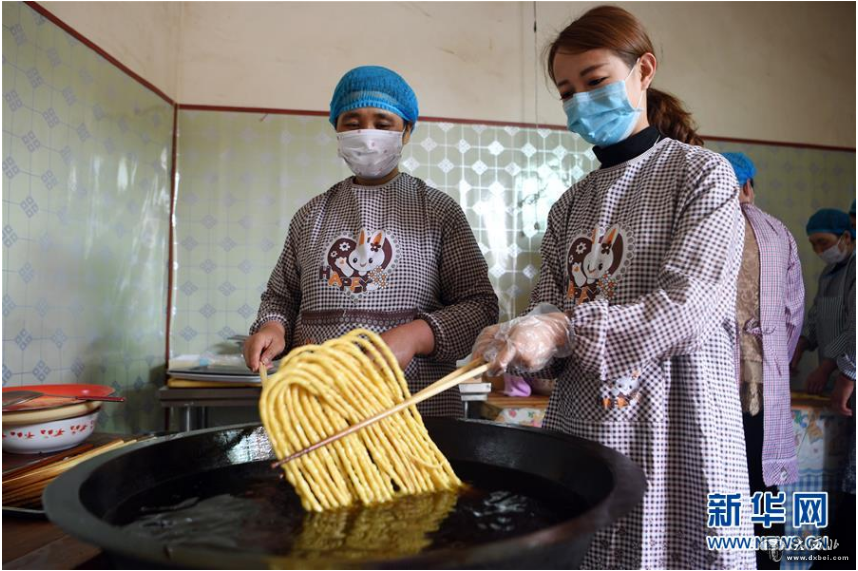在东乡族自治县锁南镇锁南村,马娟(右)和员工一起加工油馃馃(5月24日摄)。1991年出生的马娟是甘肃省临夏回族自治州东乡族自治县锁南镇锁南村人。2014年从兰州一所院校本科毕业后,她考上了西安建筑科技大学的研究生。2017年,当同学们大都在城市找工作的时候,马娟独自返回家乡开始创业。“家乡很贫困,我觉得自己应该回到家乡发展事业。”马娟介绍说,当地的特色食品油馃馃一直很受欢迎,而制作油馃馃又是当地妇女基本都掌握的手艺,马娟决定把家乡的美食推向市场。她召集村里的贫困妇女到作坊加工制作油馃馃,并制定加工标准,自己动手进行包装设计、产品推广,从网店搭建到实体销售,每个细节马娟都亲手完成。功夫不负有心人,自今年1月份上线销售以来,马娟打造的东乡油馃馃供不应求。经过几个月的运营,马娟的创业项目得到了肯定,她被当地组织部门评为巾帼创业能人。为了帮助马娟扩大创业规模,同时带动贫困妇女脱贫,当地政府把一处位于东乡族自治县高山乡布楞沟村的企业援建扶贫车间交由马娟运营和管理。如今,布楞沟村50多户贫困家庭的妇女在家门口的扶贫车间制作油馃馃,有了一份稳定的收入。新华社记者范培珅摄
